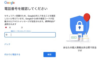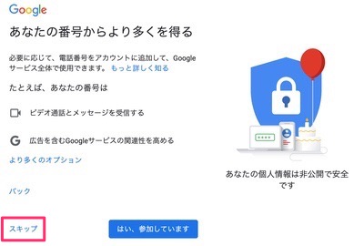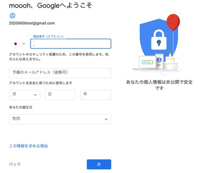 「予備のメールアドレス」はセキュリティ面では重要ですが、作成後に設定することもできるので今は省略しても良いでしょう。