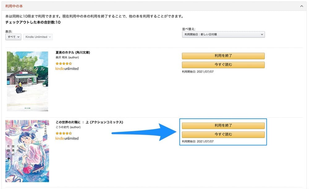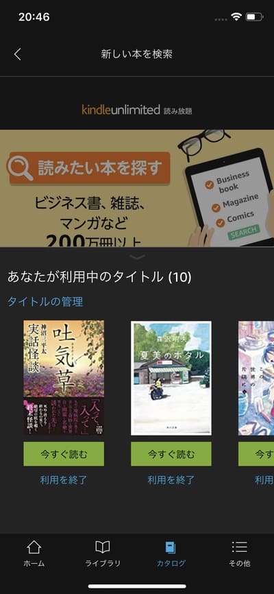 読み終えた本やイマイチだった本は利用を終了しておくと、新しい本をスムーズに購入することができますよ。