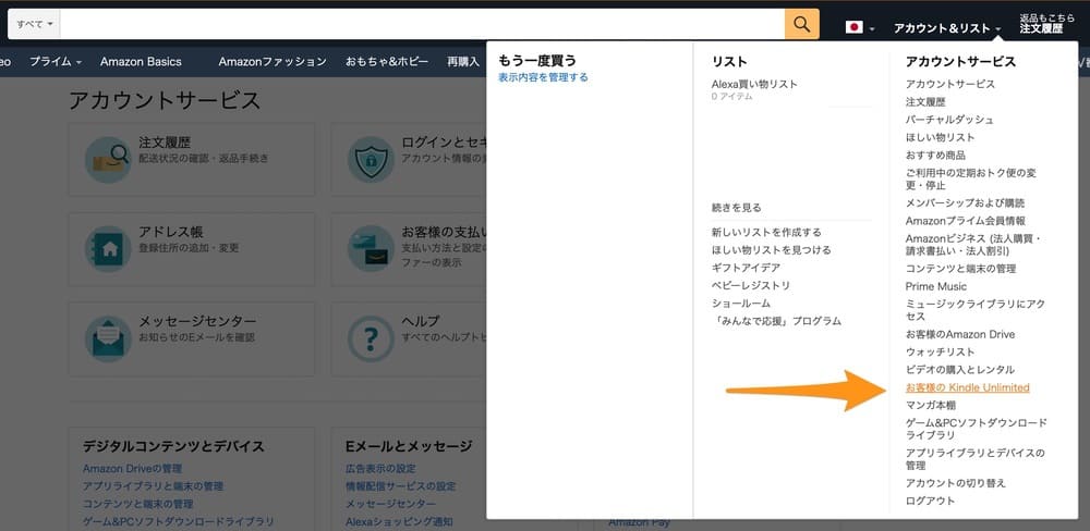 amazonにアクセスし、画面上部にあるメニューから[アカウント&リスト]をクリックし、中から[お客様のKindle Unlimited]の項目を選択します。
