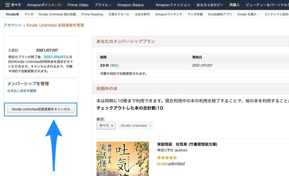 表示された画面の左側のメニューに、[Kindle Unlimited会員登録をキャンセル]の項目があるのでクリックしましょう。その後いくつか質問が来ますが、全てキャンセルをタップし続ければ解約完了です。