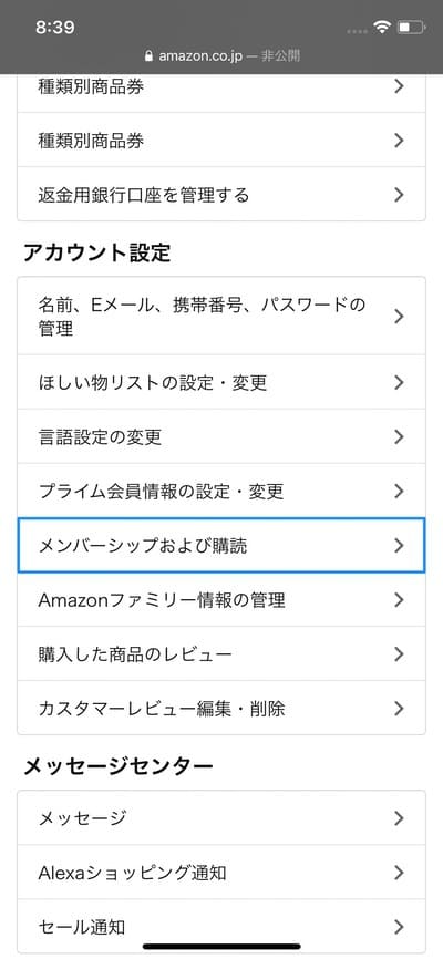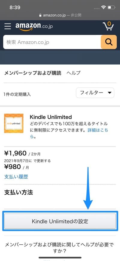 お支払い方法を変更したい場合は、amazonの画面右上にある[アカウント&リスト][お客様のKindle Unlimited]と進み、左側の[メンバーシップを管理]の項目から[お支払い設定を編集]を選択します。