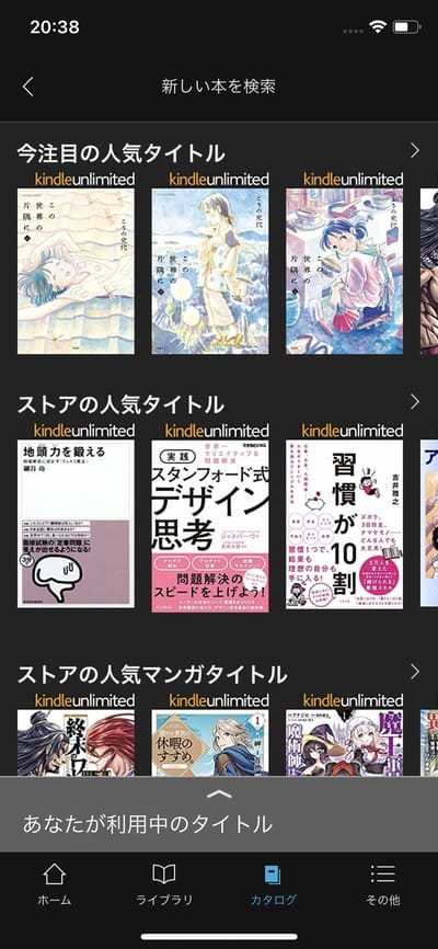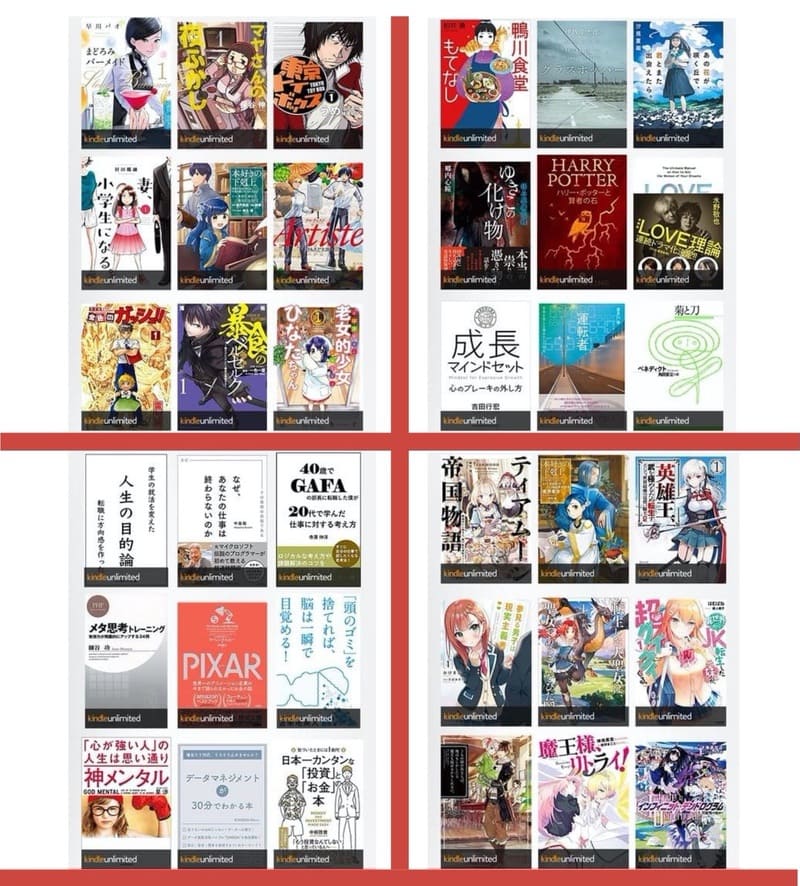 amazonでの販売を踏まえると当然ですが、新作の小説や漫画がKindle Unlimitedの対象になることはありません。最近話題になっている漫画の、1巻や2巻だけKindle Unlimitedに登場するということは結構あります。