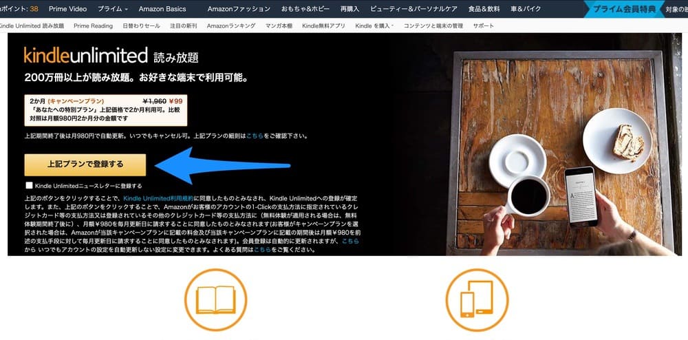 amazon内にあるKindle Unlimitedの専用ページへアクセスし、[30日間の無料体験]のボタンをクリックしましょう。登録が完了すればすぐに読書を開始することができます。