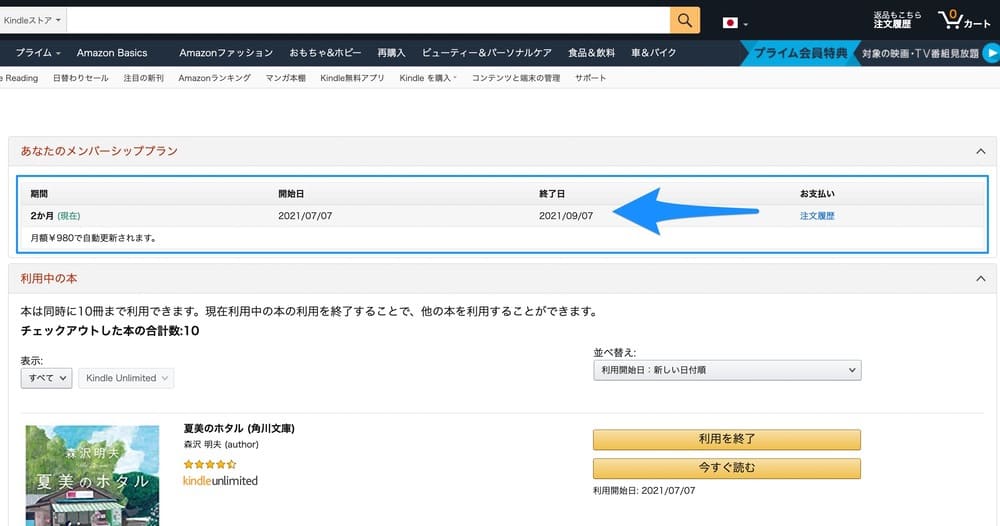 画面右上にある[アカウント&リスト][お客様のKindle Unlimited]と進み、[あなたのメンバーシッププラン]から現在のプランを確認することができます。