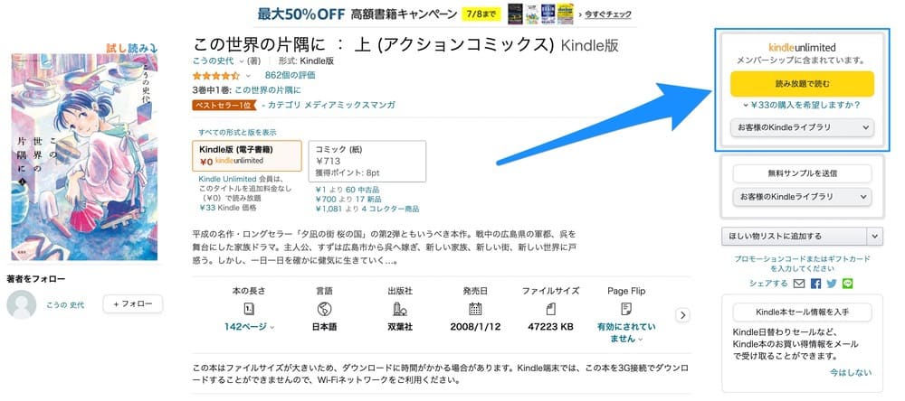 対象タイトルの中から読みたい本が見つかったら、商品ページの購入ボタンの上にある[読み放題で読む]ボタンをクリックします。