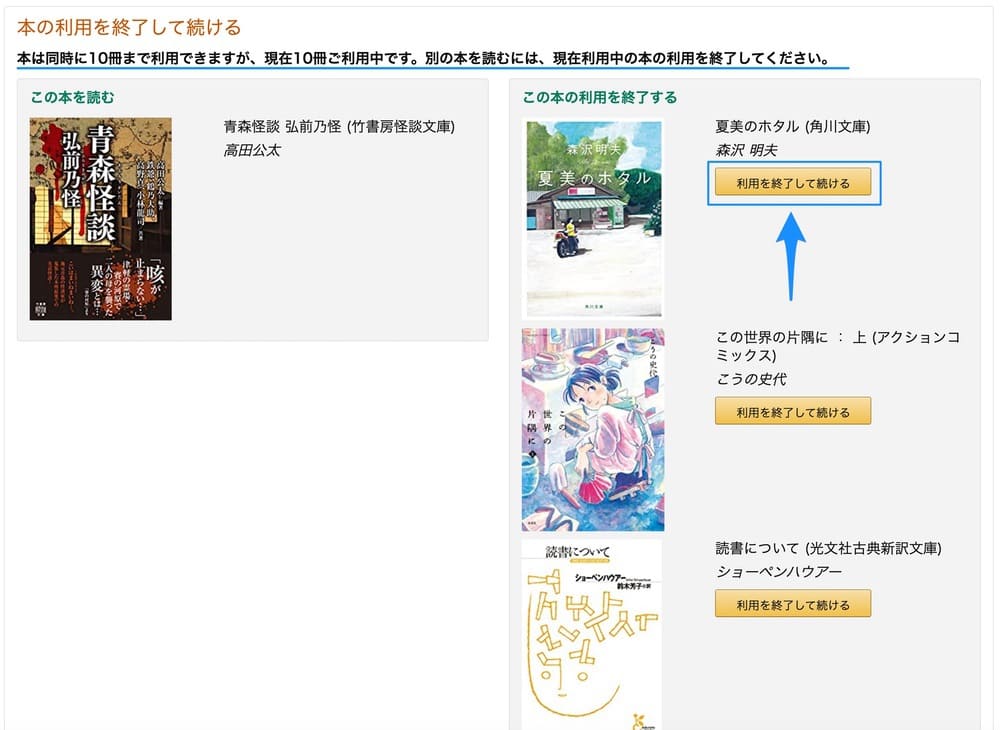Kindle Unlimitedの対象タイトルは、一度にまとめて購入できるのは10冊までです。10冊以上本を購入する場合は、同じ数の本の利用を終了しなければなりません。