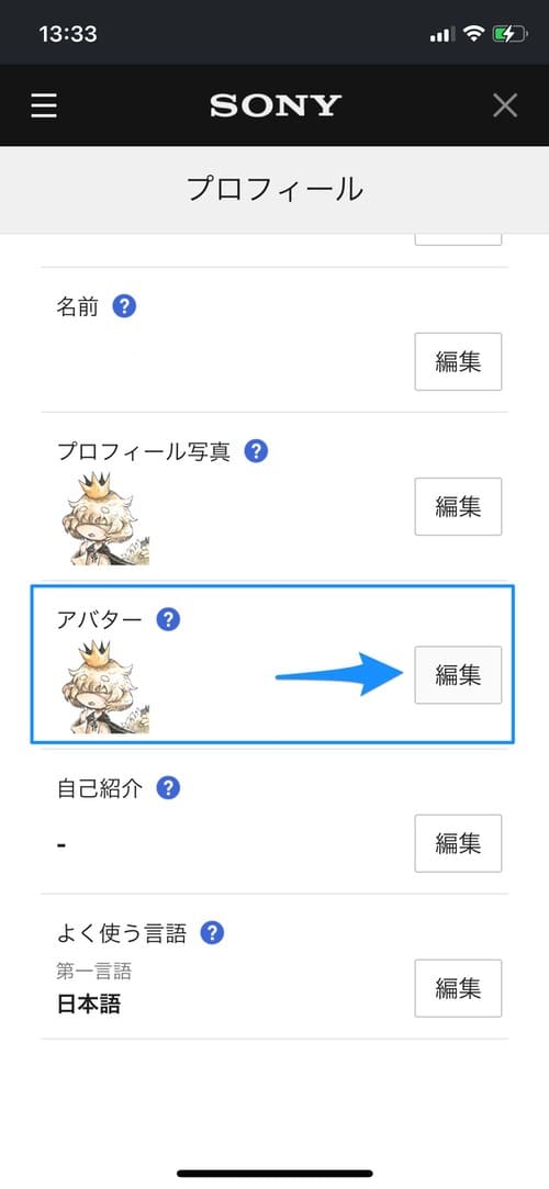 PSNアカウントの設定画面に進むので、サイドメニューの[プロフィール]から[アバター]を選択し[編集]をタップします。購入したすべてのアバターがまとめられているので、好きなものを設定しましょう。