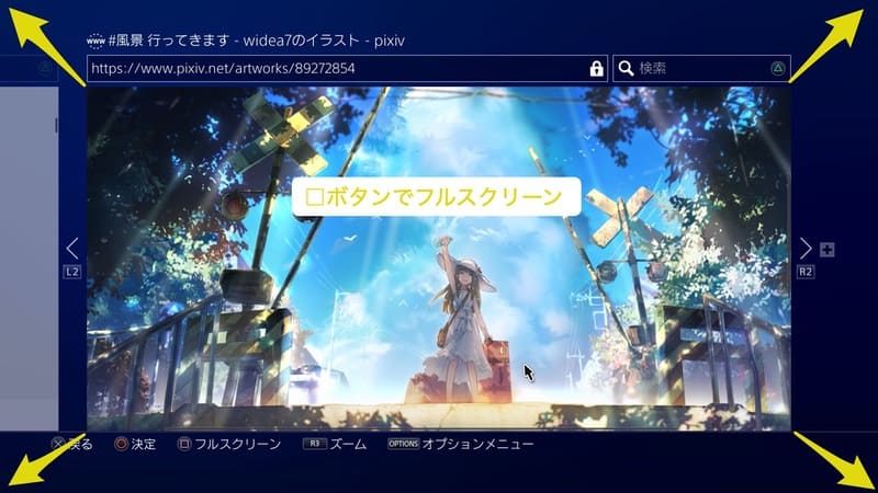 全画面サイズに切り替えても、画像によっては余白が残ることがあります。その場合は、[R3ボタン]でズームできるので、余白が上手く隠せるよう調整しましょう。