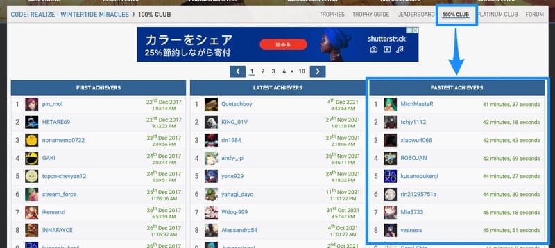 作品ページの上部メニューから[100% CLUB]を選択し、右側の[FASTEST ACHIEVERS]からトロコンまでの時間を早い順にチェックすることができます。
