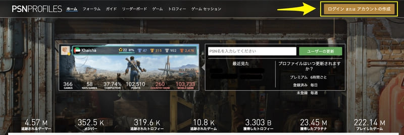 まずはPSNProfilesにアクセスし、画面右上の[ログインまたはアカウントの作成]をクリックします。