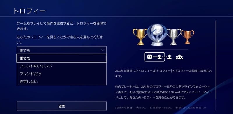この場合はPS4側のトロフィーの公開設定が非公開になっているからだと思われます。そのため、以下の手順で[プライバシー設定]を変更してみてください。