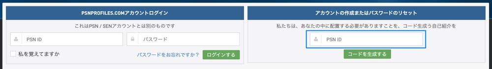 新規登録を行うので右側のメニューに移動し、空欄に[PlayStation Network ID]を入力していきます。入力が終わったら[コードを生成する]をクリックします。