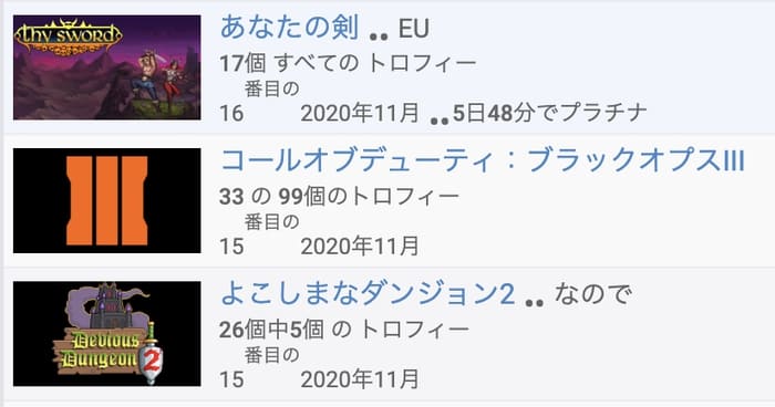 プロフィールページを下にスクロールすると、現在トロフィーを獲得しているゲームが最新順に一覧で表示されます。