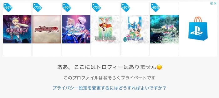 これでPSNProfilesの方でも、トロフィー情報が表示されるようになっているはずです。PS3・PSVitaをお使いの方は、PSNProfiles ヘルプをチェックしてみてください。
