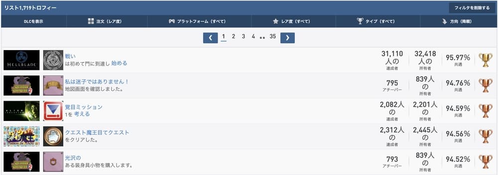 しかも全ユーザーの獲得率が高いトロフィーから表示してくれるので、次に何をプレイするかの目安にすることができます。