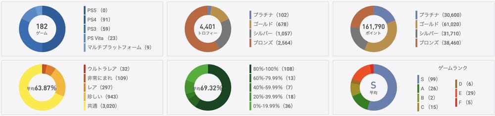 一番上の円グラフからは、トロフィーや達成率の内訳、ゲームランクやレアリティの数などを確認することができます。