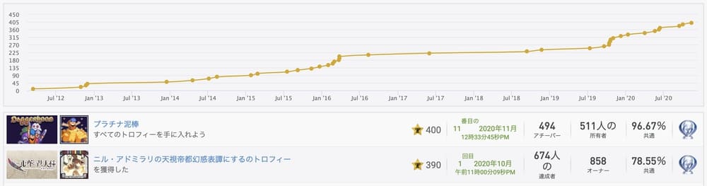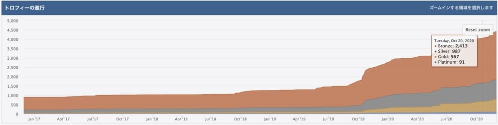 このグラフの一番左側をチェックすると、初めてトロフィーを取得した日時を確認することもできますよ。