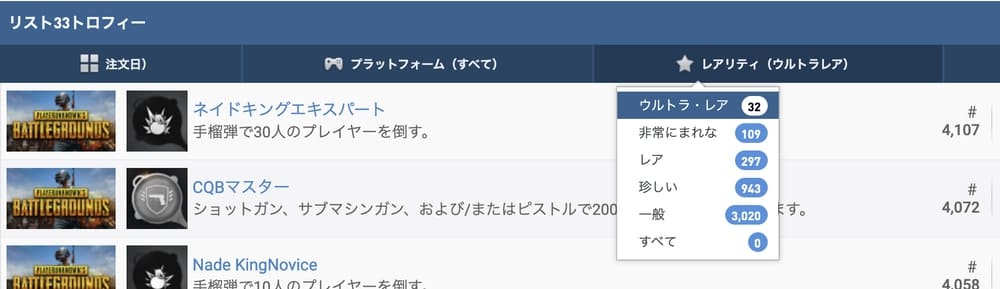 各トロフィーには取得率によるレアリティが設定されており、取得率の低いものはウルトラレアに分類されます。