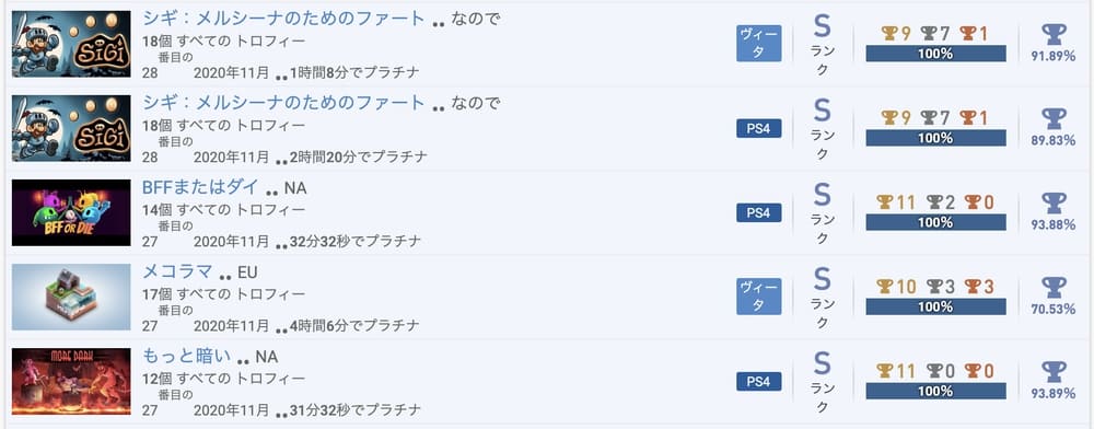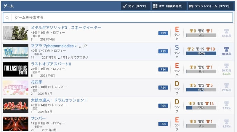 ユーザーページにアクセスすれば、そのユーザーが獲得しているトロフィーを最新順でチェックすることができます。[プラチナ獲得時間]や[機種]など、トロフィーレベルをあげる上で参考になる情報をたくさん確認することができます。