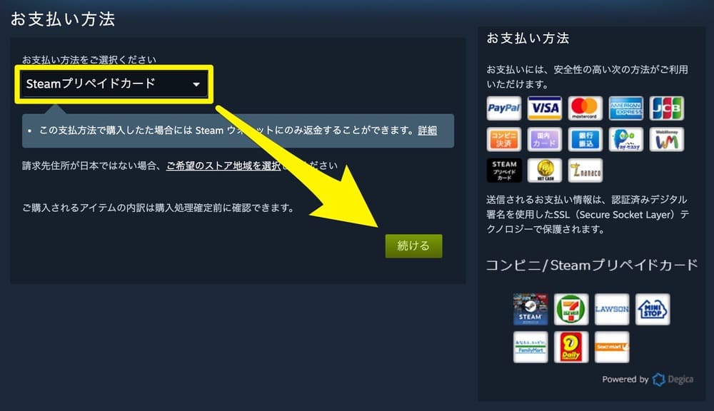 購入時の支払い方法の選択画面まで進んだら、支払い方法のメニューから[Steamプリペイドカード]を選択し[続ける]をクリックします。