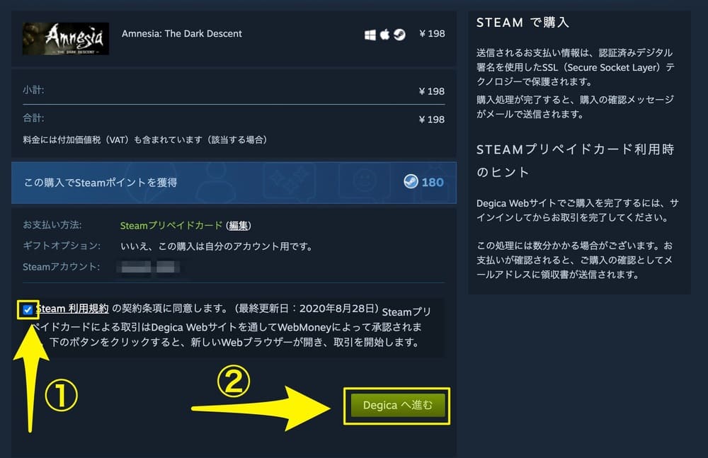 購入の確認画面へと進むので[利用規約]にチェックを入れ[Degica へ進む]をクリックします。