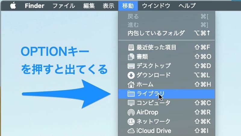 [Finder]を起動した状態でデスクトップ画面上部メニューから[移動]を選択し、OPTIONキーをクリックすることで表示される[ライブラリ]フォルダを開きます。