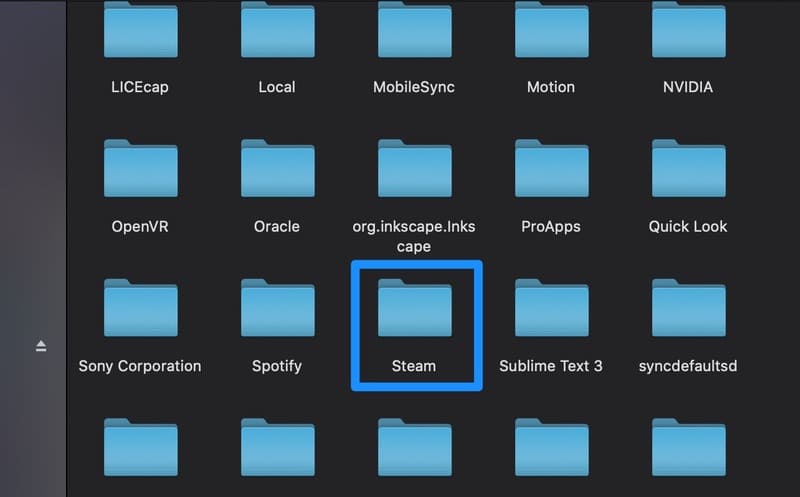 するとアプリケーションのフォルダが一覧で表示されるので、中から[Steam]フォルダを選択して開きます。