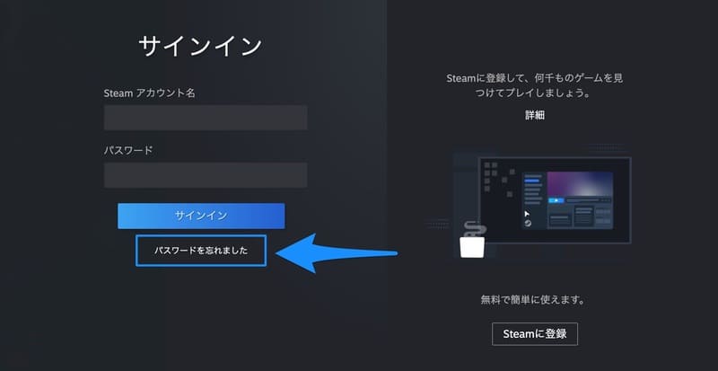 Steamのアカウントにログインするためにはアカウント名の入力が必要になり、それを忘れてしまうとログインができなくなってしまいます。