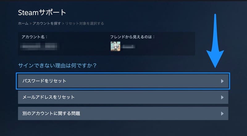 アカウント名の確認画面まで進んだら、メニューから[パスワードをリセット]を選択します。