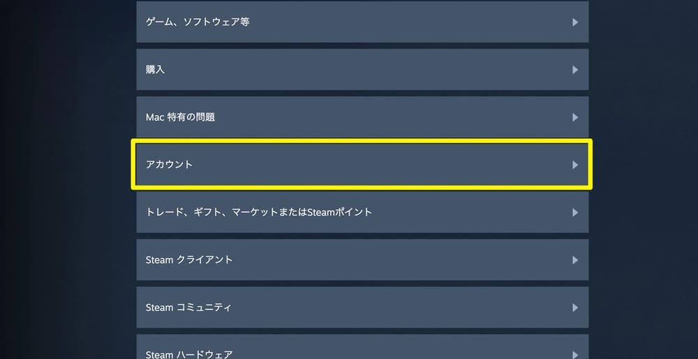 Steamサポートの画面へ進むので、中から[アカウント]の項目をクリックします。