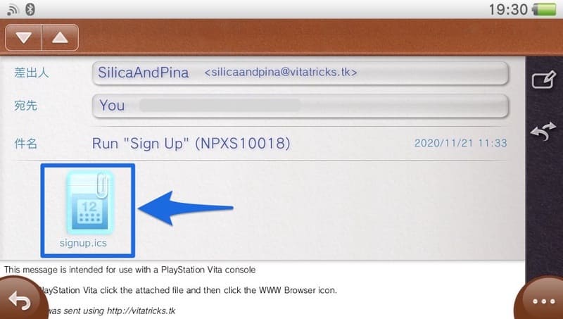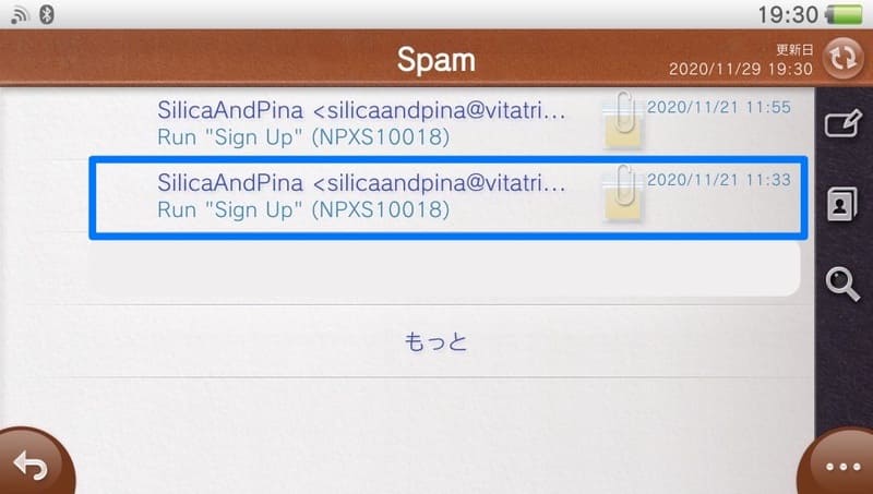 メールを送信したらVitaのメールアプリケーションへ戻り、送信したメールを確認します。おそらくスパムボックスに届いているはずです。