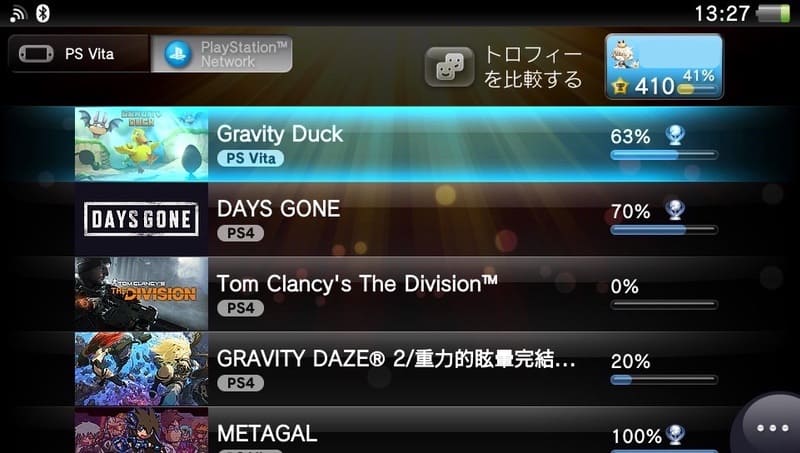 [PlayStation Network]をタップすると、PSVitaに登録しているアカウントにトロフィー情報が同期されていきます。この時、右上に表示されているアカウントが日本アカウントになっていればOKです。