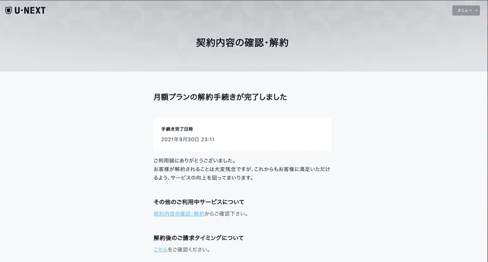 もしくはWEB版のU-NEXTから[アカウント設定][契約内容の確認・解約][解約手続きはこちら]から確認することもできます。