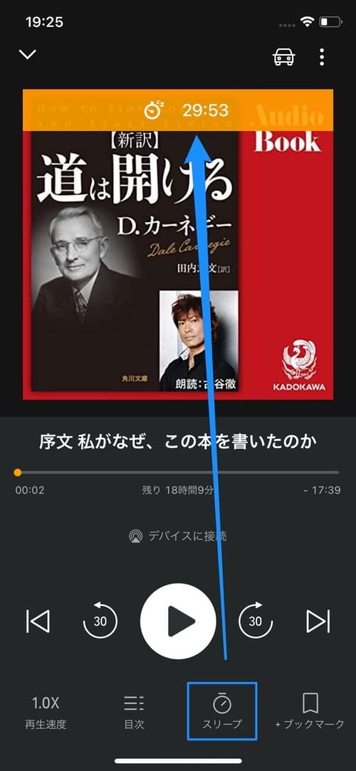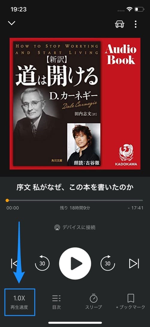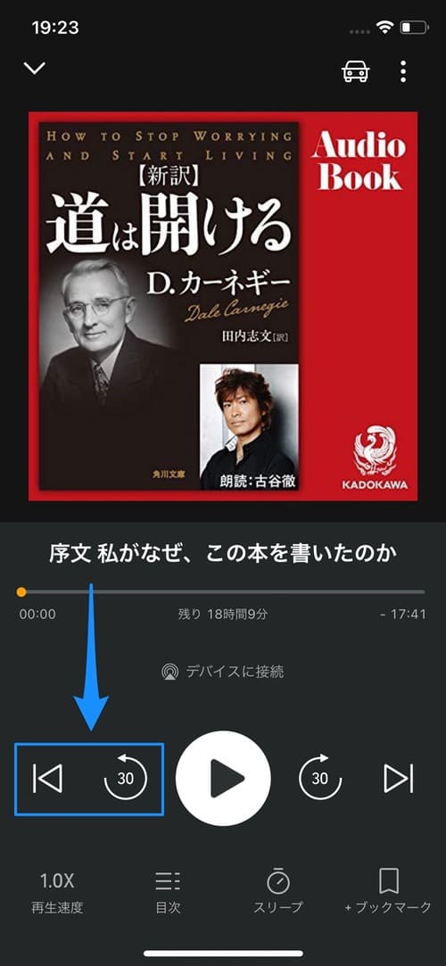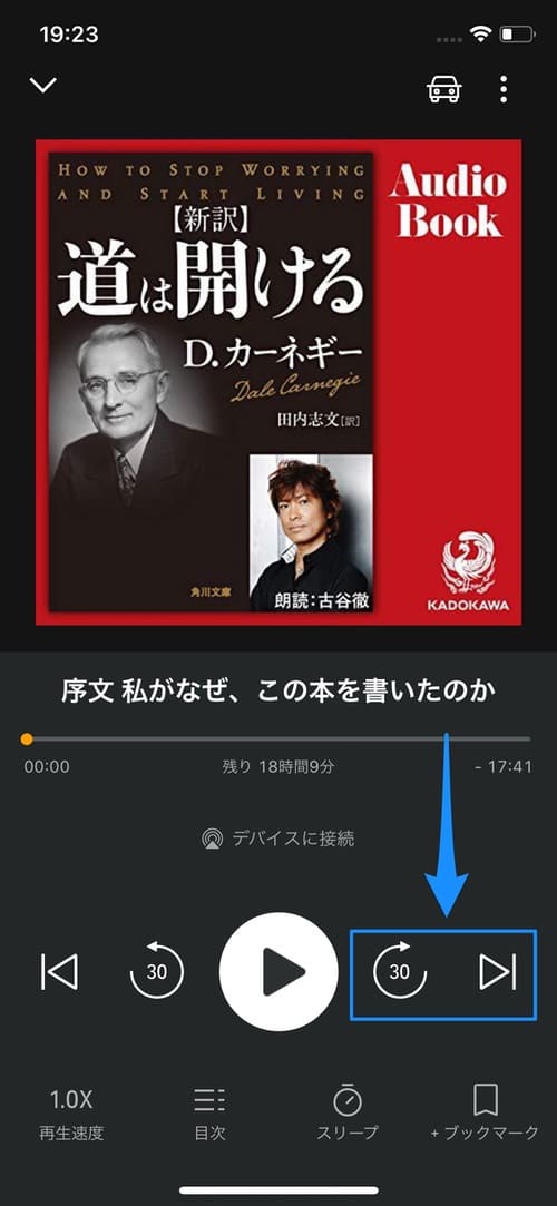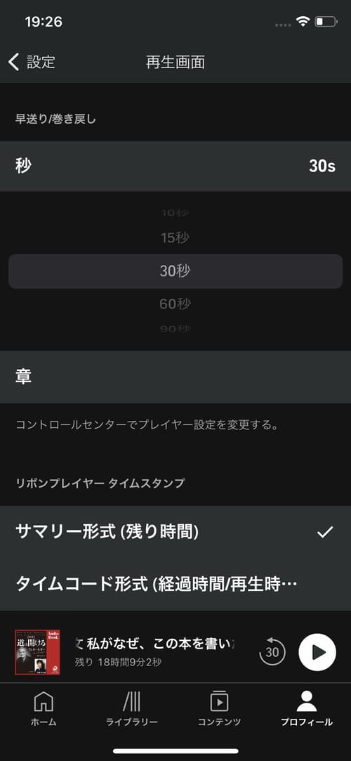 早送りの時間については、設定から変更することができます。また早送りアイコンの右側にある[]ボタンをタップすると、次の章までジャンプすることができます。