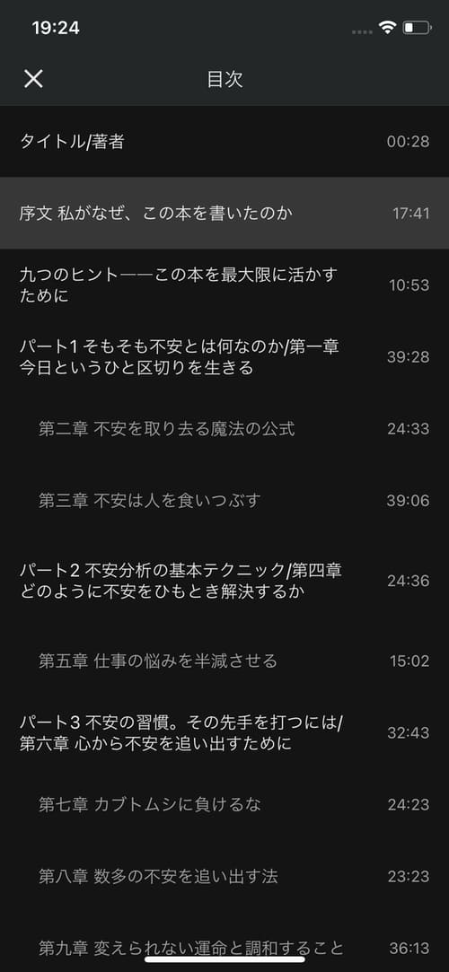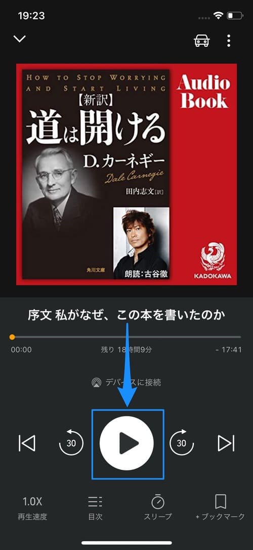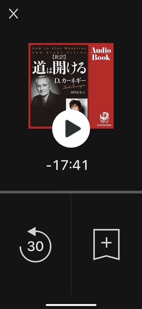 再生画面はこのような感じで、音楽アプリとほとんど変わりません。中央に残り再生時間が表示され、アイコンをタップすることでスキップや巻き戻しを行えます。