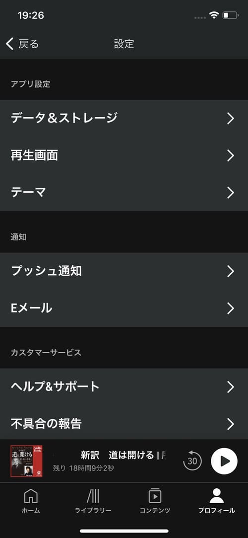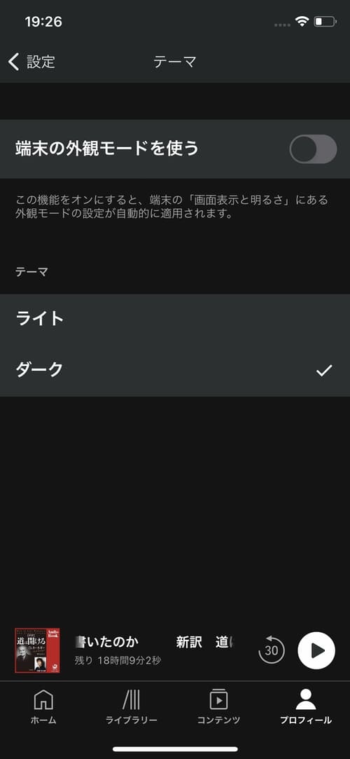 Audibleのテーマですが、iPhoneⅩなど端末側でダークモードに設定している場合は、[端末の外観モードを使う]をオンにすることで自動でダークモードに設定されます。