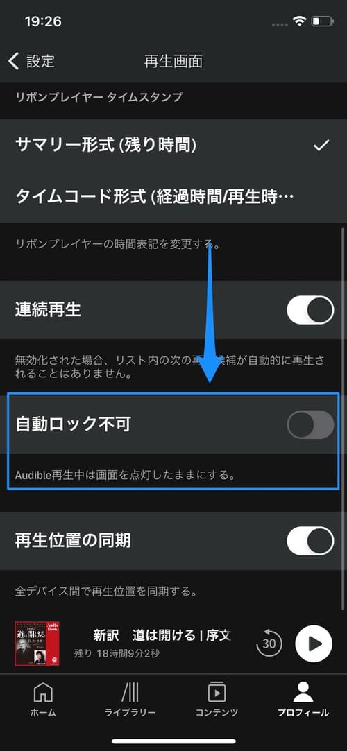 自動ロックを不可にすると、Audibleの再生中はスマホの画面がロックされなくなります。操作しやすい反面、バッテリーの消費量がアップするというデメリットもあるので注意しましょう。